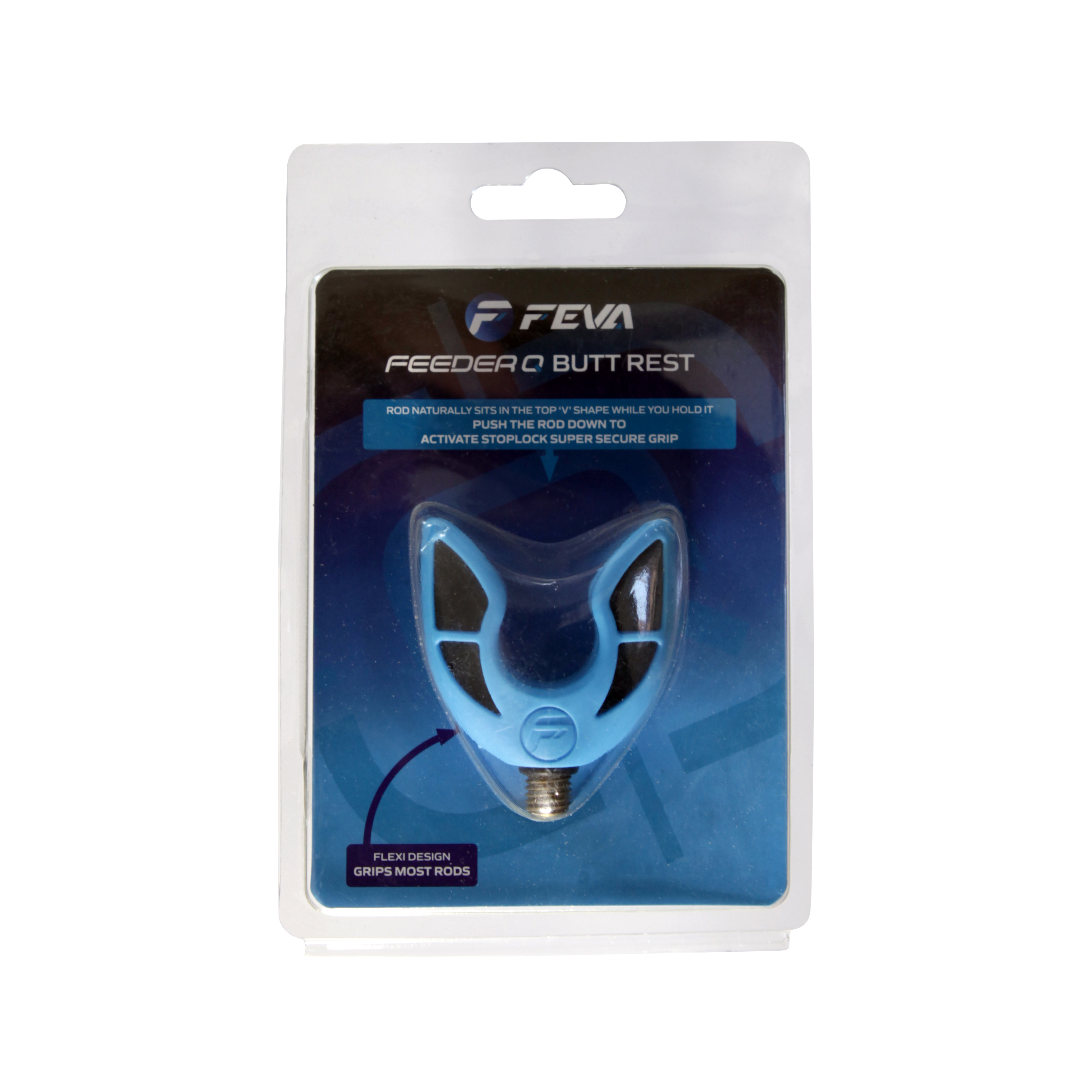 This is the butt rest in the Feeder-Q range from Feva. Your rod will naturally sit in the top V-shape of the design when you have your hand on the rod, or you can press the handle of the rod down into the rest and it will grip super tight (ideal if you're about to open your drink or look at your phone). This butt rest will accommodate different size rod diameters, so nearly every feeder rod will be compatible - genius! Featuring a secure brass thread, as well as a soft flexible TPE rubberised structure to protect the rod. The overall size is very compact too.